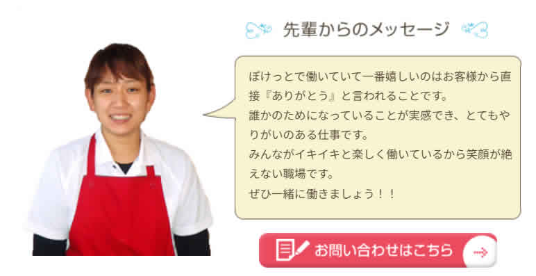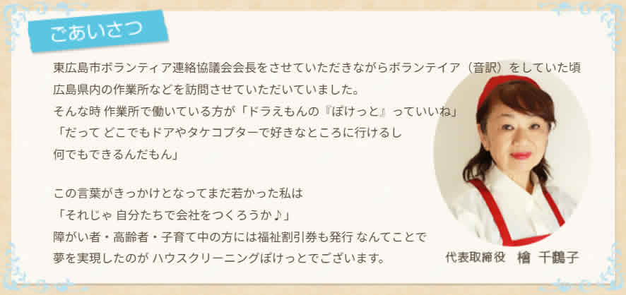 ごあいさつ 東広島市ボランティア連絡協議会会長をさせていただきながらボランテイア(音訳)をしていた頃 広島県内の作業所などを訪問させていただいていました。 そんな時 作業所で働いている方が「ドラえもんの『ぽけっと』っていいね」 「だって どこでもドアやタケコプターで好きなところに行けるし 何でもできるんだもん」 この言葉がきっかけとなってまだ若かった私は 「それじゃ 自分たちで会社をつくろうか♪」 障がい者・高齢者・子育て中の方には福祉割引券も発行 なんてことで 夢を実現したのが ハウスクリーニングぽけっとでございます。 代表取締役 檜 千鶴子 本社・工場所在地広島県東広島市八本松町正力1276-5 TEL082-428-1812 FAX082-428-1815 お問い合わせお問い合わせフォームからお問い合わせください。 所在地広島店:広島県広島市東区若草町15-16 事業内容■清掃業務 ○ハウスクリーニング、新築引き渡し清掃 ○店舗、会社、病院の日常清掃・定期清掃、床清掃 ○エアコン清掃、草刈り ○不用品の片付け など ■家事代行業務 ○家事代行サービス ○お手伝いサービス ○整理整頓サービス ○生前整理 ○遺品整理 ■資格・講座 ○ハウスクリーニング士 ○整理・収納・清掃(3S)コーディネーター ○マナー研修・お掃除研修 ○ガイドヘルパー研修講座 商号木船槐安堂 ひのき屋本店 事業内容■内装工事業務 ○畳表替、襖(ふすま)貼替、障子・網戸貼替、クロス貼替 ○畳の部屋をフローリングにリフォーム ○オーダーカーテン・ブラインド設置等 ■リフォーム業務 ○システムキッチン、システムバス、トイレ改修工事 名称工房おんぶにだっこ 事業内容草刈り、わらじ作り、講座 ぽけっとでは一緒に働いてくれるスタッフを募集しております。お掃除や家事が好きな方、人の役に立つ仕事がしたい方におススメのお仕事です。お客様からの「ありがとう」が嬉しいそんなお仕事です。ご興味ある方は一度お問い合わせください。 ぽけっとで働いていて一番嬉しいのはお客様から直接『ありがとう』と言われることです。 誰かのためになっていることが実感でき、とてもやりがいのある仕事です。 みんながイキイキと楽しく働いているから笑顔が絶えない職場です。 ぜひ一緒に働きましょう!!